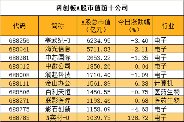 以上市首日收盘价计算,N奕材-U最新A股市值超千亿元,在科创成长层中排名第二,仅次于寒武纪-U,也是目前科创成长层中仅有的两家千亿市值企业之一,在整个科创板中A股市值排名前十。